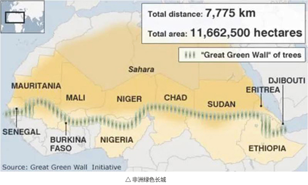 “非洲綠色長城”是2007年經(jīng)非洲聯(lián)盟決議的一項(xiàng)泛非植被屏障倡議,涵蓋了撒哈拉沙漠北部和南部所有的干旱與半干旱區(qū),核心區(qū)域面積為7.8億公頃,涉及2.32億人口,現(xiàn)已成為非洲經(jīng)濟(jì)社會的“綠色屏障”,被稱之為“非洲準(zhǔn)備面對未來的象征”。